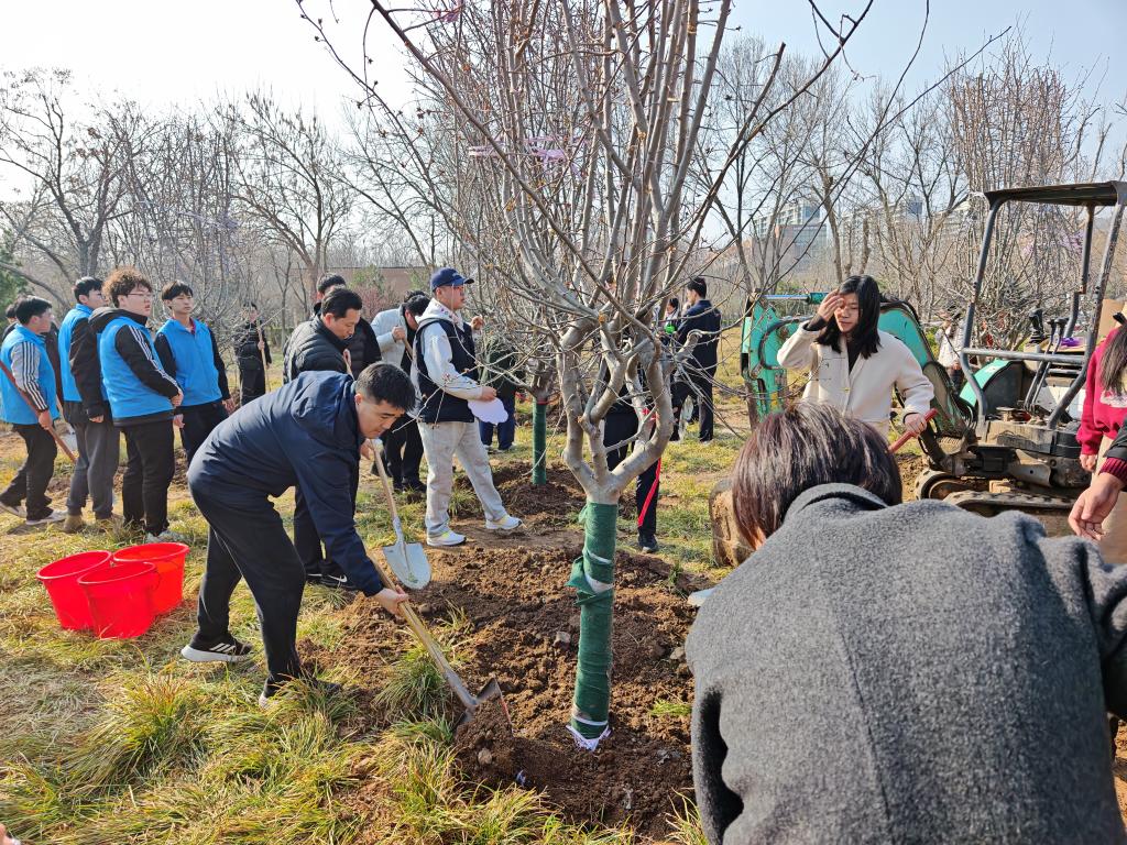 活动现场,党旗迎风飘扬,气氛热烈有序。大家分工协作、默契配合,有的挥锹挖坑、有的扶苗填土、有的提水浇灌,每一道工序都一丝不苟、认真细致。经过一下午的辛勤劳动,一排排新栽的树苗整齐挺立、迎风舒展,为春日校园增添了一抹盎然绿意,也播下了生态文明建设的种子。